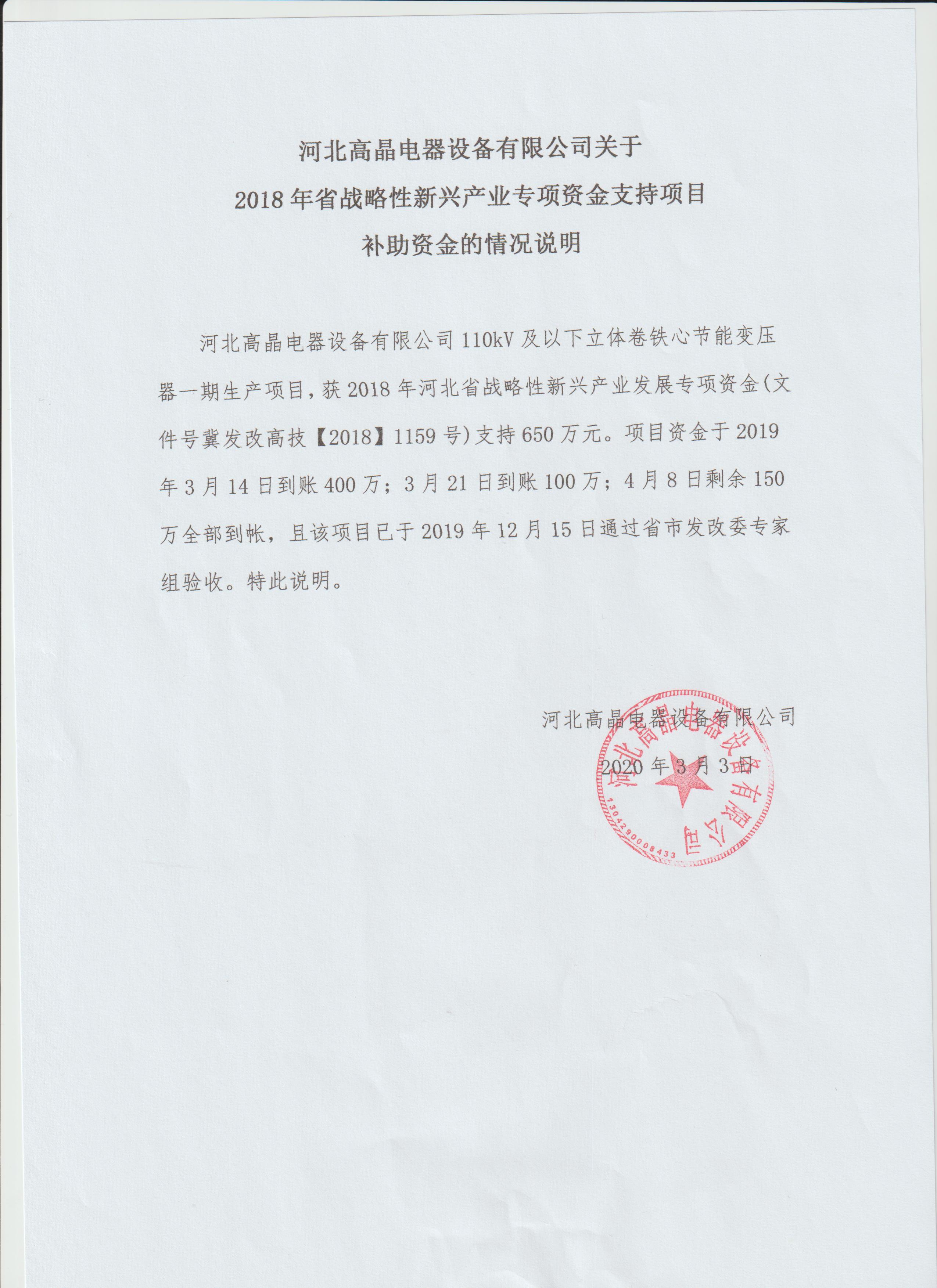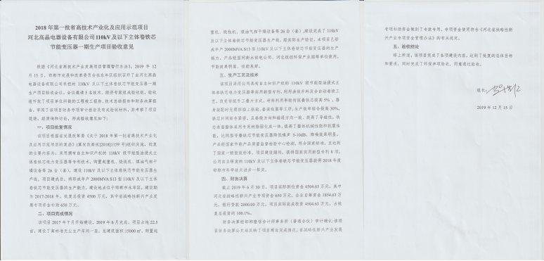 根據(jù)《河北省高技術(shù)產(chǎn)業(yè)發(fā)展項(xiàng)目管理暫行辦法》,2019年12月15日,邯鄲市發(fā)展和改革委員會(huì)在永年區(qū)組織召開了由河北高晶電器設(shè)備有限公司承擔(dān)的110kV及以下立體卷鐵心節(jié)能變壓器一期生產(chǎn)項(xiàng)目(年產(chǎn)2000MVA S13型110kV及以下立體卷鐵心節(jié)能變壓器)驗(yàn)收會(huì)。會(huì)議邀請(qǐng)技術(shù)、經(jīng)濟(jì)專家組成驗(yàn)收組,驗(yàn)收組聽取了項(xiàng)目工程竣工報(bào)告、技術(shù)總結(jié)報(bào)告和財(cái)務(wù)決算報(bào)告,審閱了財(cái)務(wù)專項(xiàng)審計(jì)報(bào)告及有關(guān)驗(yàn)收材料,并考察了項(xiàng)目現(xiàn)場。經(jīng)質(zhì)詢和討論,該項(xiàng)目完成了各項(xiàng)建設(shè)內(nèi)容,達(dá)到了批復(fù)的總體目標(biāo)和要求,同意通過驗(yàn)收。