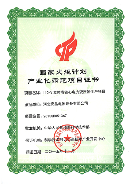 國(guó)家火炬計(jì)劃產(chǎn)業(yè)化項(xiàng)目證書(shū)