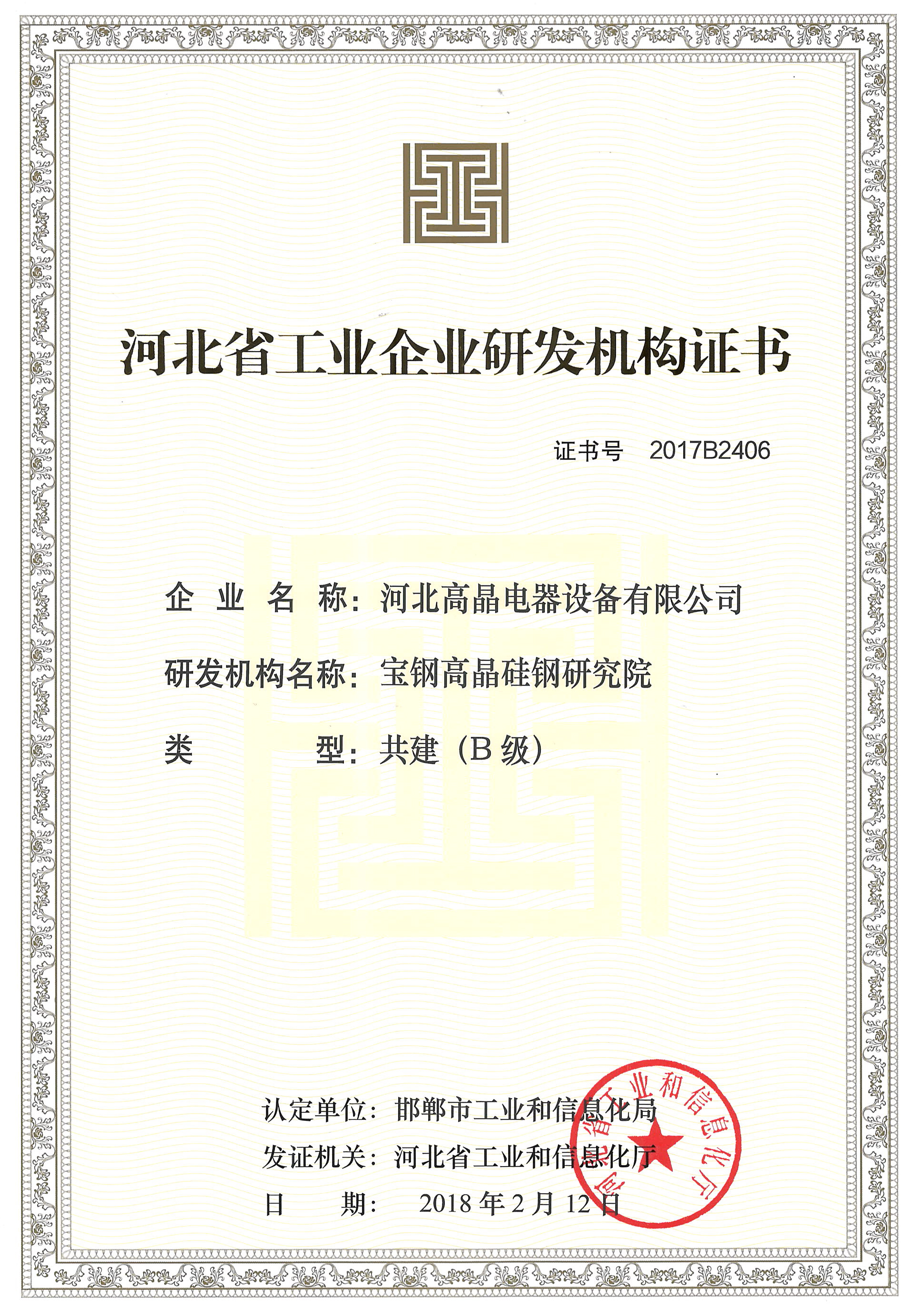 河北省工業(yè)企業(yè)研發(fā)機(jī)構(gòu)證書(shū)